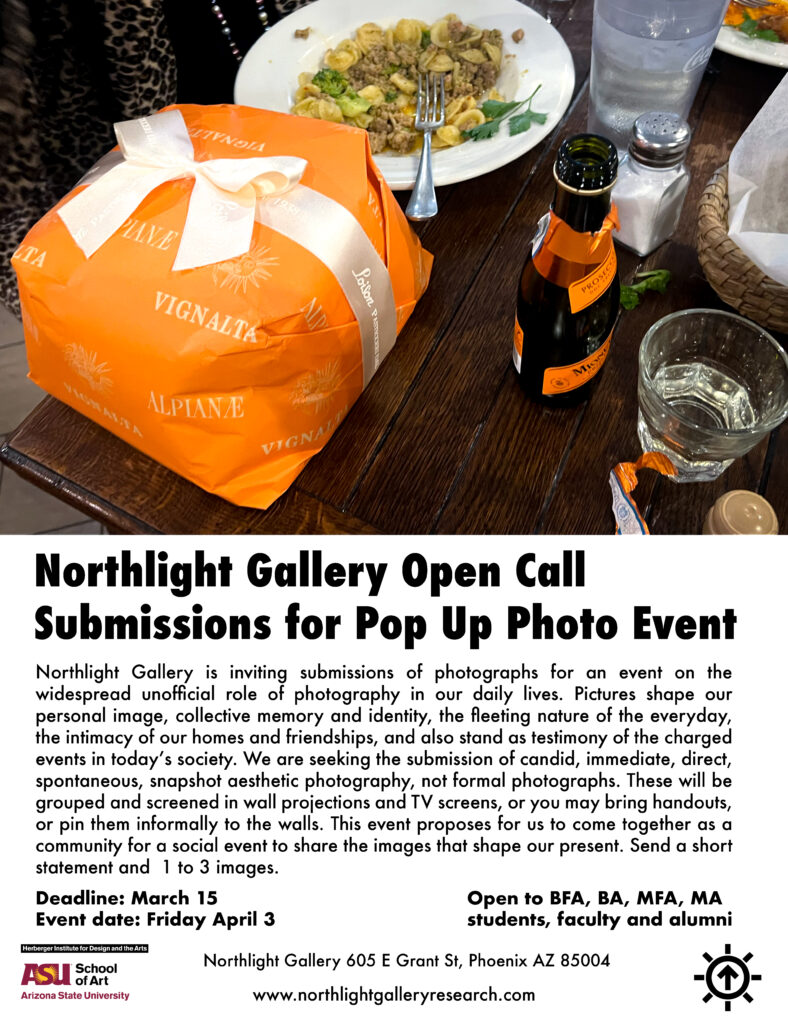 Northlight Gallery is inviting submissions of photographs for an event on the widespread unofficial role of photography in our daily lives. Pictures shape our personal image, collective memory and identity, the fleeting nature of the everyday, the intimacy of our homes and friendships, and stand as testimony of the charged events in today’s society. We are seeking the submission of candid, immediate, direct, spontaneous, snapshot aesthetic photography, not formal photographs. These will be grouped and screened in wall projections and TV screens, or you may bring handouts, or pin them informally to the walls. This event proposes for us to come together as a community for a social event to share the images that shape our present.